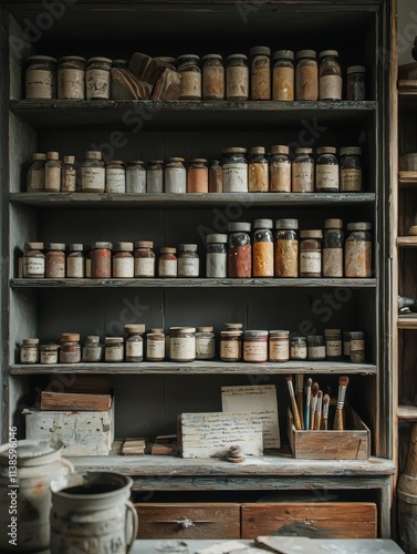 Art supplies on wooden shelves evoke a vintage studio vibe with jars of paint and brushes creating a nostalgic atmosphere.