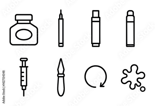 Art supplies outline icon set – artistic tools for creative projects, sketching, and crafting: ink bottle, pen, marker, syringe, paintbrush, paint drop, circular arrow