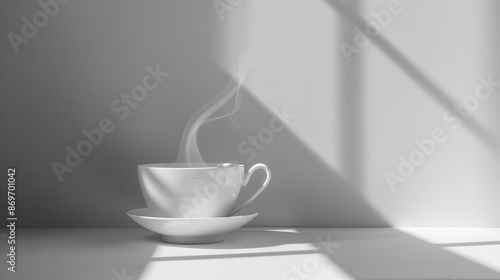 artful still life of a pristine white coffee cup on seamless background steam rising in delicate wisps subtle shadows add depth showcasing minimalist beauty in everyday objects