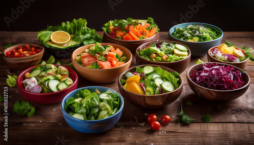 artfully arranged colorful fresh salads in bowls on a rustic wooden table with green garnishes