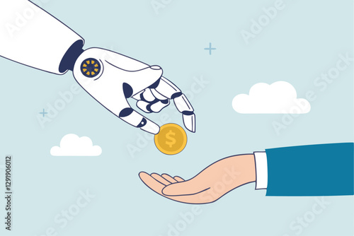 Artificial intelligence AI make money, data licensing resource for AI training payment, automation investment, robot trading or banking concept, AI robot hand giving dollar money to businessman.