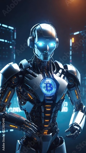 Artificial intelligence bitcoin robot, crypto currency, cyber security, financial futuristic digital tecnology concept image.