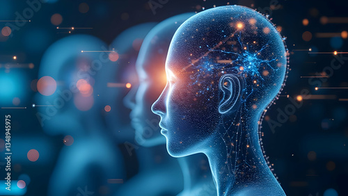 Artificial intelligence brain with a glowing neural network and digital human profile, featuring a blue and orange color scheme, interconnected nodes, and futuristic technology concepts.