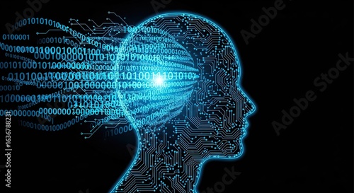Artificial intelligence brain with digital data flowing into head