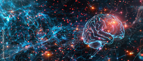 Artificial Intelligence Digital Background with a Futuristic High-Tech Illusion of Computer Symbol Style, Featuring Deep Blue Gradient and Red Bokeh Lights for Enhanced Depth and Contrast, Perfect for