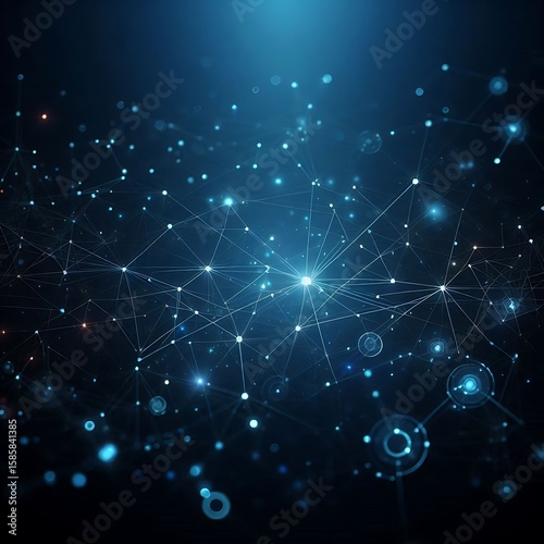 Artificial intelligence network. Abstract of a digital network illuminated by blue light, showing interconnected nodes and lines on a dark backgroun
