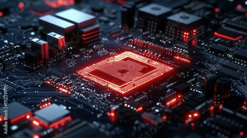 Artificial Intelligence Trends. Close-up of futuristic microchip on digital circuit board, technology innovation concept for AI, computing, electronics, cyber security, tech industry, high-tech backg