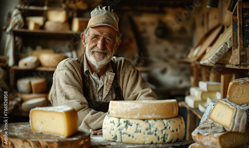 Artisan cheese maker with a variety of cheeses in a traditional cheese shop. Handcrafted produce and gourmet food concept for design and print. Portrait of a craftsman in a rustic setting