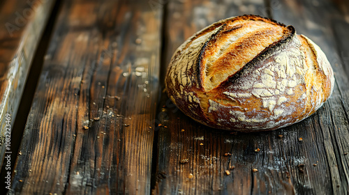 Artisan Crusty Loaf of Bread Rests on Rustic Wooden Surface