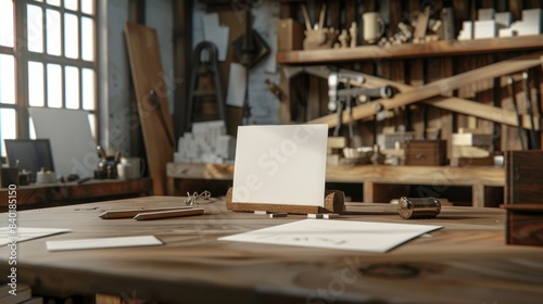 Artisanal Woodworking Custom Furniture Maker's Workshop with Handcrafted Tables Tools and Sketches Creative Workspace for Business Cards and Design Inspiration
