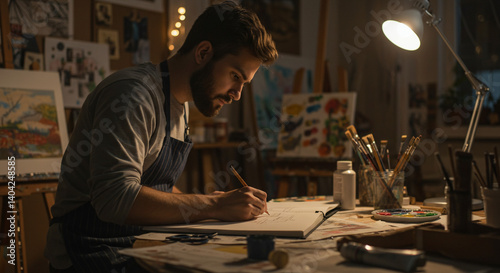 Artist sketching in his studio under the light of a lamp surrounded by paintings and art supplies