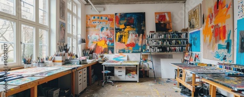 Artist studio with canvases and paint supplies, vibrant and creative environment, copy space for text.