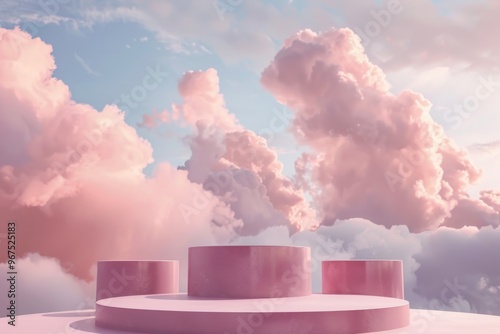 Artistic abstract with geometric shapes in pink against dreamy sky.