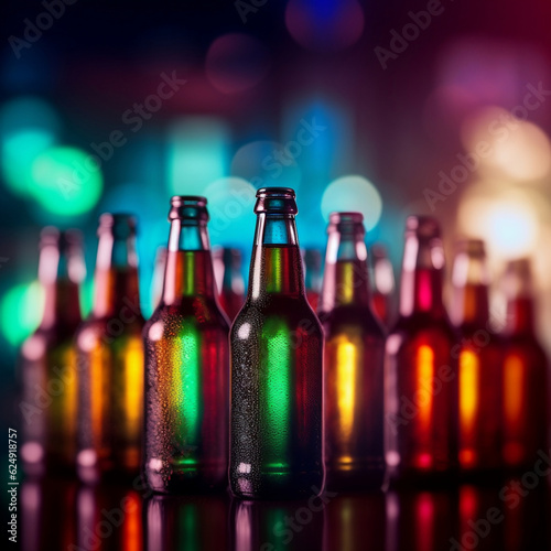 Artistic Blurred Image of Beer Bottles in a Row with Colorful Background Lights