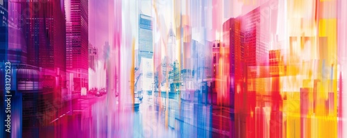Artistic cityscape with vibrant, colorful streaks simulating motion and energy