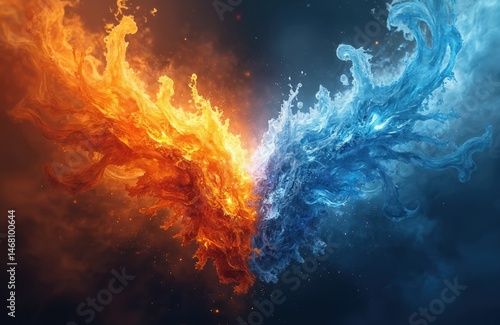 Artistic clash fire ice. Two elements combine, bright orange fire meets cool blue ice in dynamic visual. Energetic forms collide, creating contrast. Powerful imagery of conflict fusion. Abstract