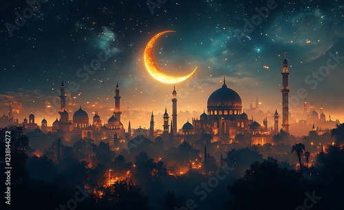 Artistic Depiction of a Cityscape with Mosques Under a Starry Sky and a Crescent Moon