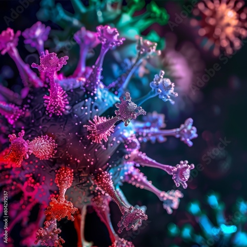 Artistic depiction of multicolored viral particles with detailed surface textures, illustrating concepts in virology and immunology research.