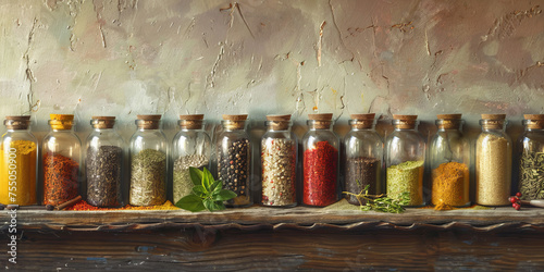 Artistic display of colorful spices in glass jars on a rustic wooden shelf with a peeling paint backdrop