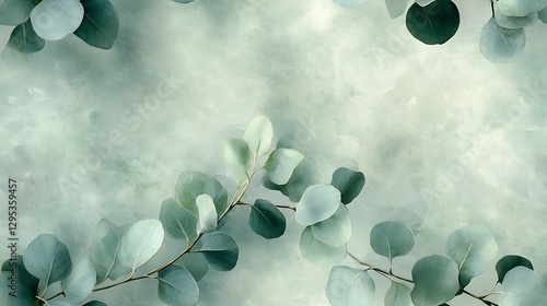 Artistic eucalyptus leaves in gentle green and gray shades, soft oil-paint textures blending seamlessly, diffused light adding a tranquil and dreamy quality, perfect for a serene decorative design.