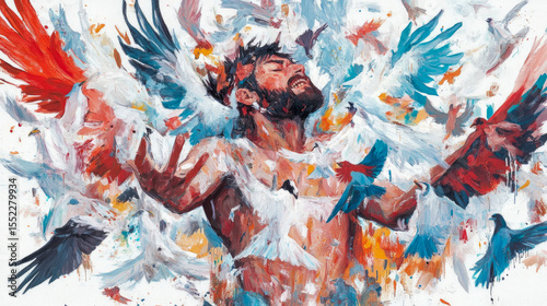 Artistic expressive painting of a man surrounded by flying birds, a modern spiritual representation, for print or home decor.