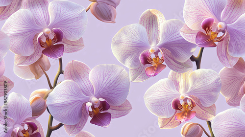 Artistic Floral Orchids Pattern Featuring Soft Purple Petals and Green Leaves for Textile Use
