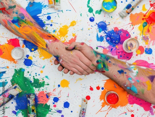 Artistic Handshake: Paint Splattered Arms Unite on White Background.