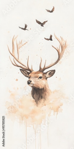 Artistic illustration of a majestic deer with antlers, surrounded by flying birds, blending nature and creativity beautifully.