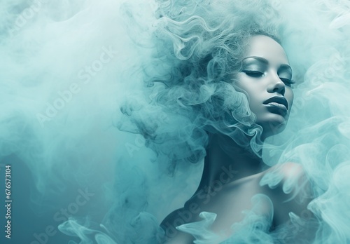 Artistic image of a serene woman surrounded by mysterious blue smoke, creating an ethereal look