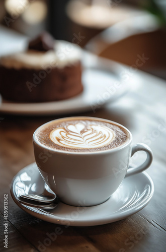 Artistic Latte with Intricate Foam Design – White Cup & Saucer, Café Ambience, Warm Lighting, Sharp Focus, High-Resolution Close-Up, Capturing Creamy