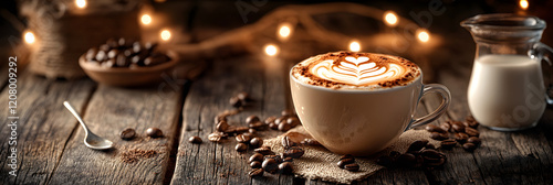 Artistic Mocha Coffee with Latte Art in Cozy Rustic Setting, Surrounded by Coffee Beans and Milk