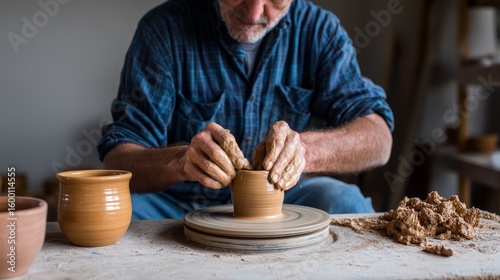 Artistic potter shaping wet clay on a spinning wheel, closeup of skilled hands creating smooth, glossy surfaces, warm earthy tones, detailed texture of moist clay, focus on craftsmanship and creativi