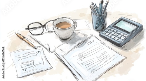 artistic sketched illustration of a analytic of financial reports on a white background