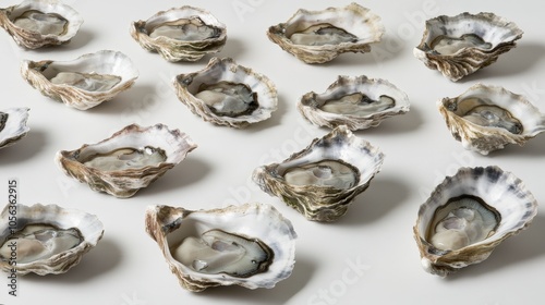 Artistic white surface showcasing a variety of fresh oysters, highlighting their freshness and the unique attributes of these invertebrate seafood items