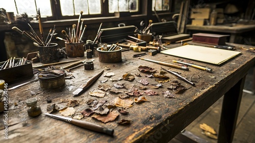 Artistic Workspace with Tools, Papers, and Dried Leaves on Table