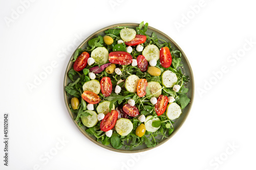 Arugula, tomato, cucumber, mozzarella and olive salad
