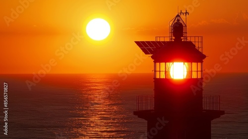 As the sun sets the solar panels atop the lighthouse begin to charge preparing for a night of guiding ships through the dark waters.