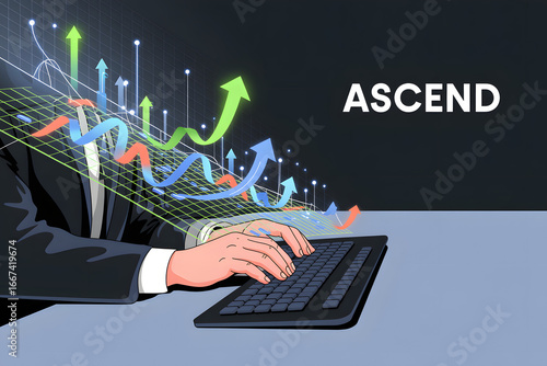 Ascend: A dynamic illustration of a professional typing on a keyboard, with animated upward-pointing arrows and the word ASCEND representing growth and progress, indicating technological advancement.