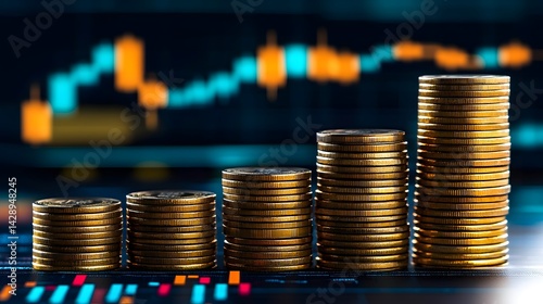 Ascending stacks of golden coins against a backdrop of financial market data.