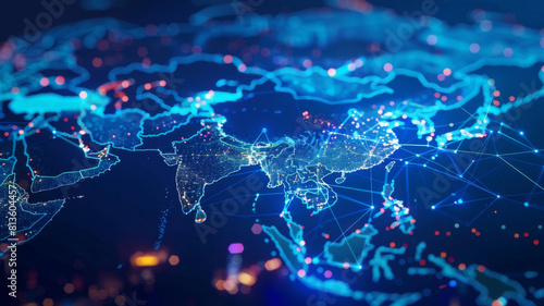 Asia map depicting global connectivity, data transfer, business exchange, and tech advancement. Concept Global Connectivity