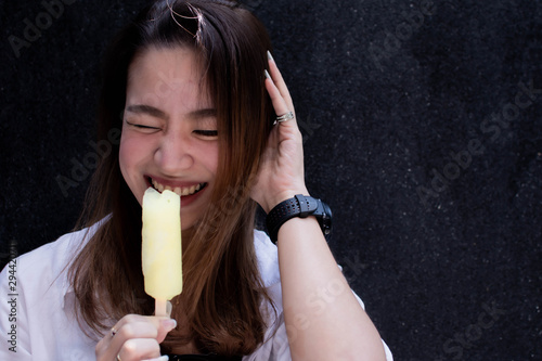 Asian beautiful woman is eating lemon icecream