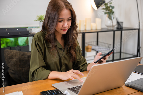 Asian business woman using laptop checking smartphone indoors home office, Happy female smile working multiple devices with computer and mobile phone, beautiful people pay digital online on desk