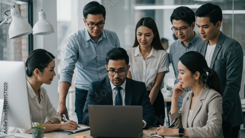 Asian businessman leading meeting with diverse professionals in modern office discussing strategies and teamwork Relevant themes include collaboration