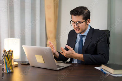 Asian businessman posing while sitting and discussing online meeting with laptop from home.