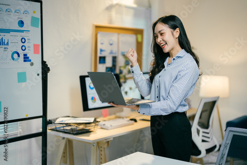 Asian businesswoman is holding a laptop and making a fist pump, excited about a recent business deal or achievement. She is standing in her office, surrounded by whiteboards and computers