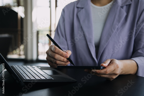 Asian colleagues man and woman discussing and working with laptop computer on office desk in the office