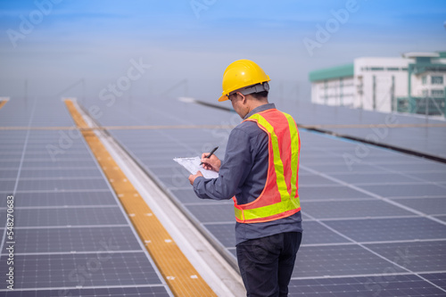 Asian Engineer checking solar power cell energy on rooftop of factory. Asian worker working install solar power solar cell system for using clean solar energy.