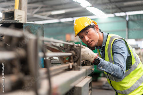 Asian engineer men wearing uniform safety metalworker working with machine at factory Industrial