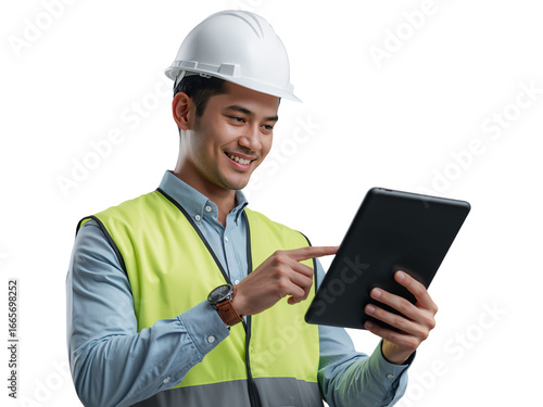 Asian engineer utilizing tablet, architectural designs and construction blueprints review, safety