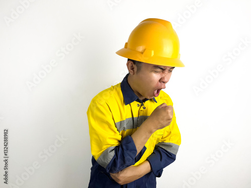 asian engineer wearing yellow helmet who coughs isolated on white background